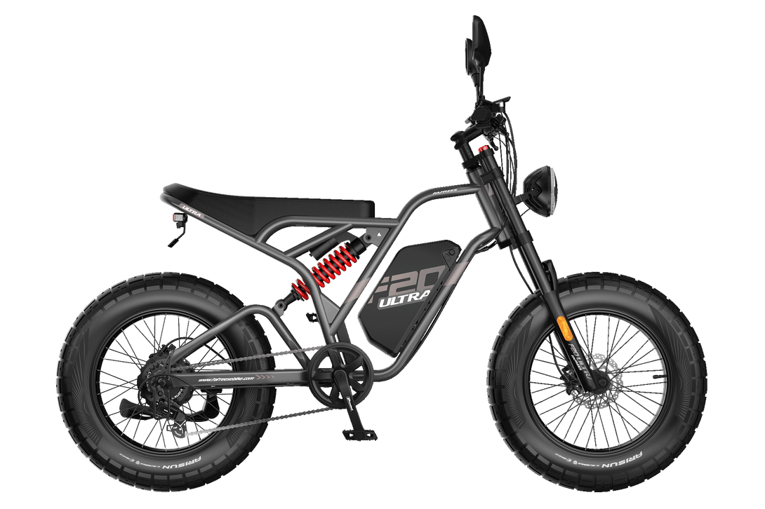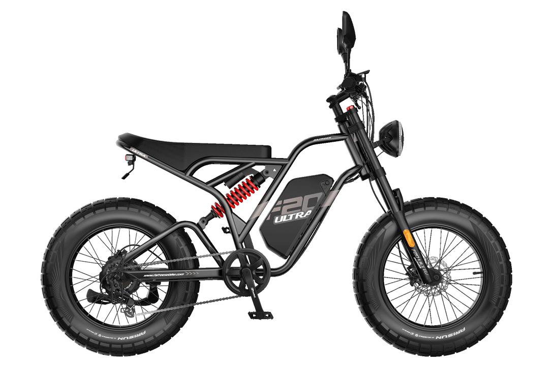 The F20 Ultra Upgrade eBike package includes the eBike, charger, owner’s manual, 2 pedals, 2 rearview mirrors, and a premium gift box with 2 brake pads, 1 inner tube, 2 valve caps, 2 reflectors, a multi-functional tool, a 13/15 wrench, and a keychain. Everything you need for your ride and maintenance!